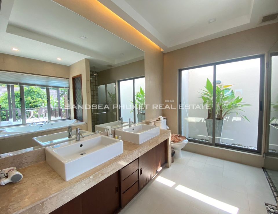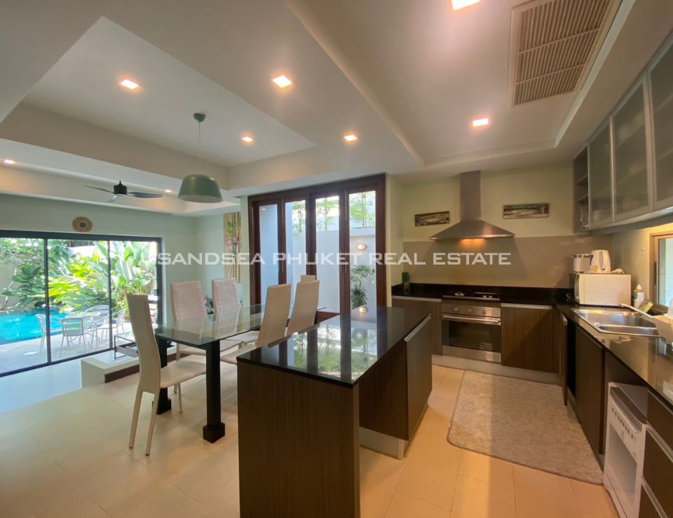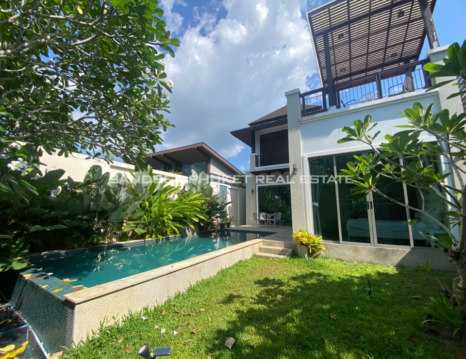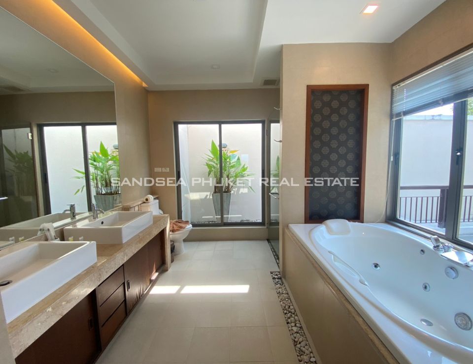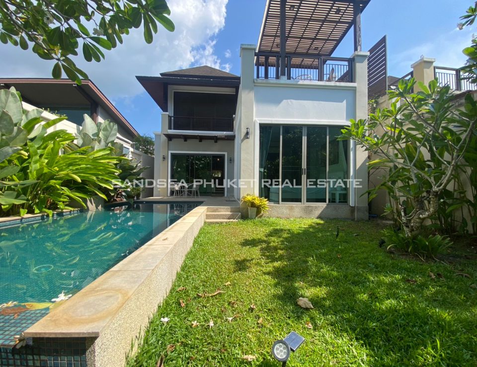 This is a modern tropical pool villa, located on the edge of Cherngtalay on the way to Heroine’s Monument, a little over 5 minutes by car from Boat Avenue and the Laguna Phuket resort complex. Popular beaches including Bangtao, Layan, and Surin are around 10 minutes’ drive. The villa has features cozy bedrooms, all with ensuite bathrooms, and the master bedroom comes with walk-in closets. The villa boasts high ceiling open-plan living and dining areas with fully equipped western kitchens. Private swimming pool and garden with a reasonable size with space for relaxation or children to run around. It is an Ideal as a holiday home or permanent family residence.