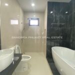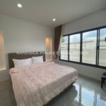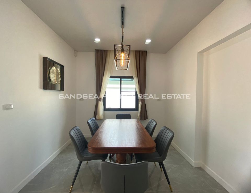 The residence is perfect for big and small families. The villa has a private swimming pool with a sala. And the garden area gives a relaxing feeling. At the front gate of the villa, which is wooden gives a modern feel, then you will see a garage big enough car and a bike. Keep walking to the large swimming pool for you to enjoy and get back to the living room, which is combined with the dining area. After the 4-seat dining table, you will see a fully equipped kitchen. All bedrooms have big windows, allow natural light to shine in.