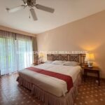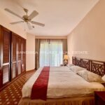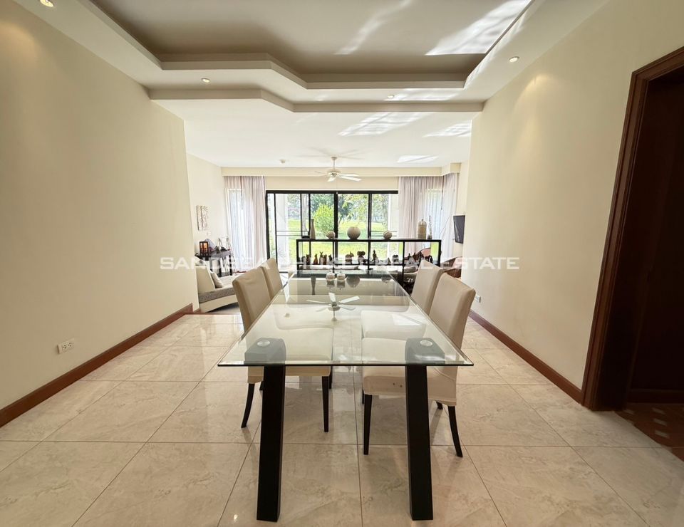 The unit is carefully designed to give each floor privacy but with a lot of space for living enjoyment. The ground floor contains the living space with a kitchen, a dining area that seats four, and a living room. The chairs that surround the round family-style dining table and the living room furniture are all a matching rattan material. The master bedroom has a big bed, desk, wardrobe and wall-mounted TV. In the second bedroom are two twin beds. There is a bathtub in the master bath. All the rooms have the same great lagoon view. The unit is facing the pool. This is a corner unit.
