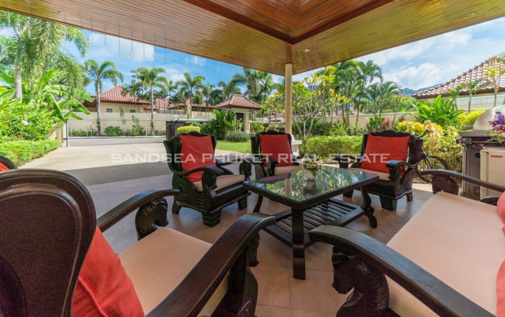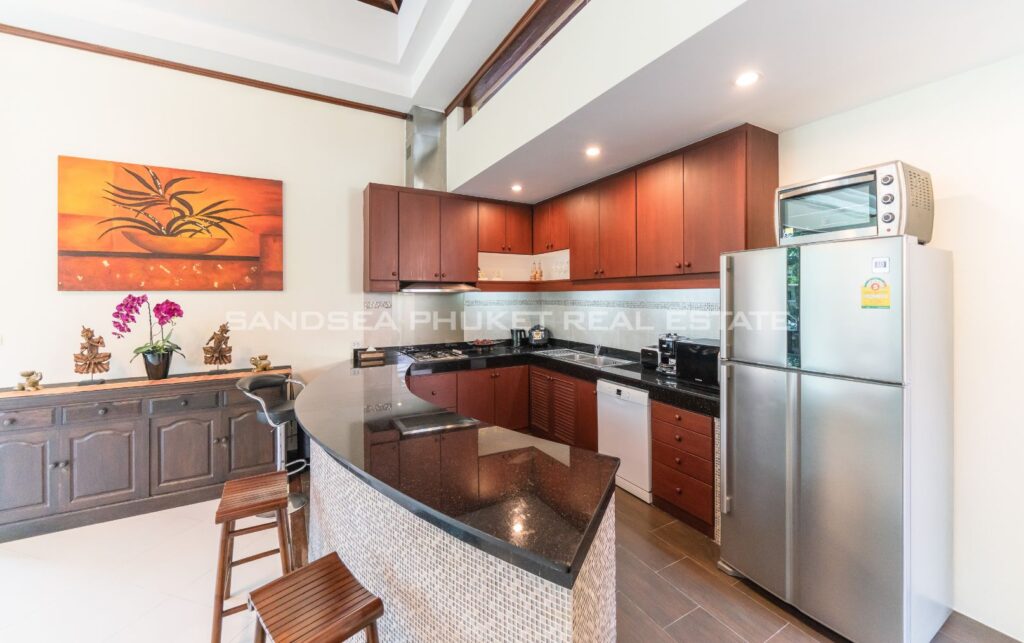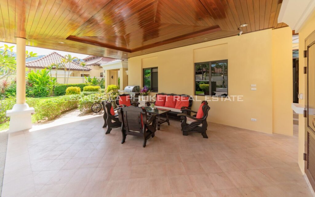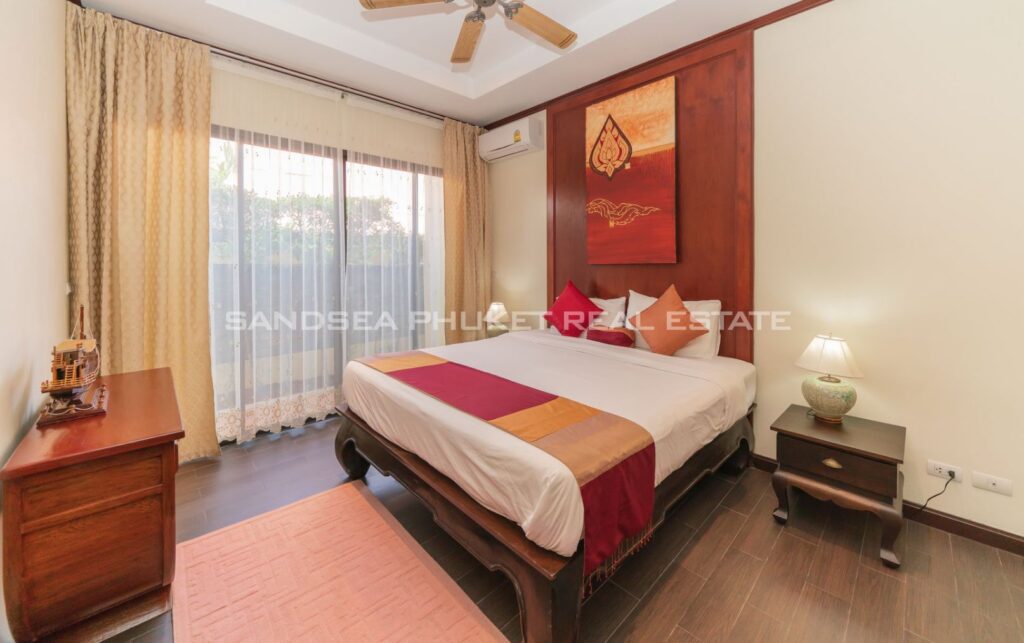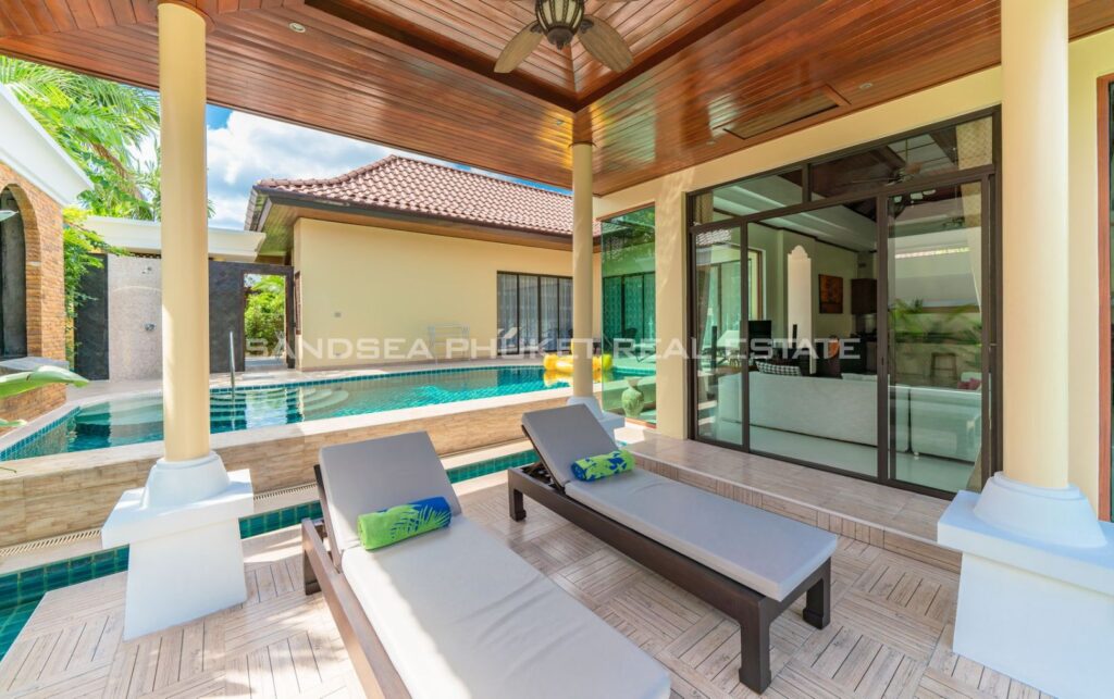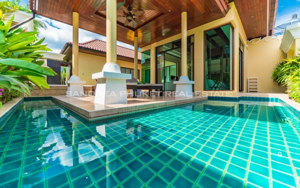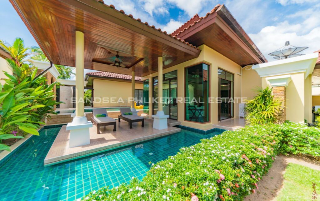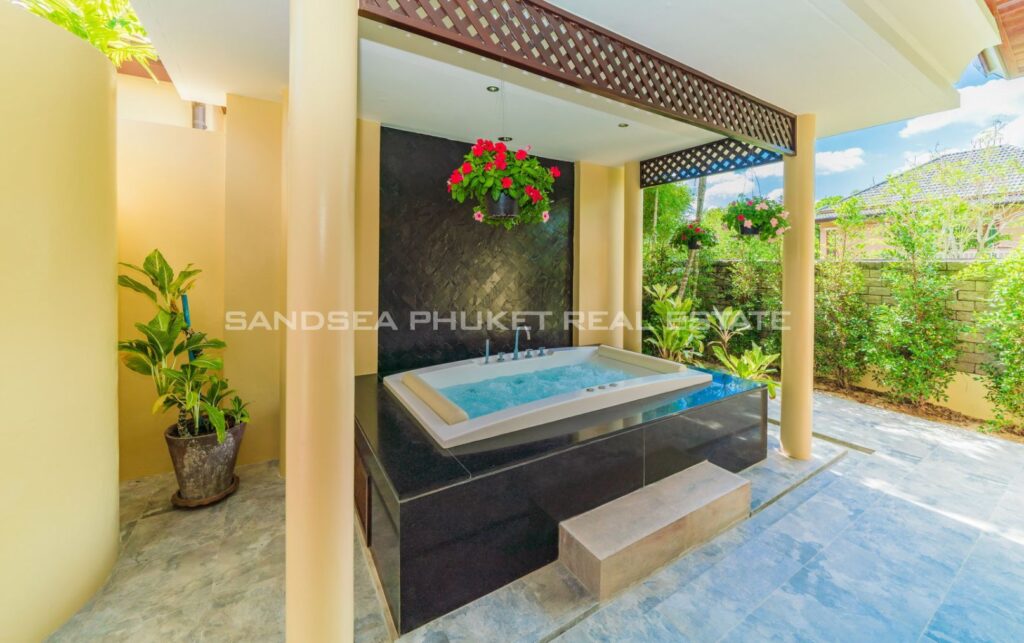 This villa is perfect for people attracted by nature and warmth. Set among tall shade trees, fresh and natural breezes, mountains and the sea. It is the perfect place to enjoy all that Phuket offers. The villa sits in Bangtao, in peaceful community near Laguna. The villa has easy access to Banyan Tree, and nearby attractions include Layan beach, Bangtao and Surin beach. The villa has an open plan living area which blends seamlessly with the pool terrace and green environment. The formal dining area sits adjacent, and the full western kitchen is well-planned with an impressive U-shaped design. The bedrooms all feature built-in wardrobes, ensuite bathrooms, and elegant, modern Thai furnishings. The master suite features an open air jacuzzi. Each room has individually controlled air-conditioning. The pool is a generous 8×4 m. there is also a second, shaded lounge area toward the front of the house with garden views. *The rate includes pool cleaning, gardening, cable TV and internet.