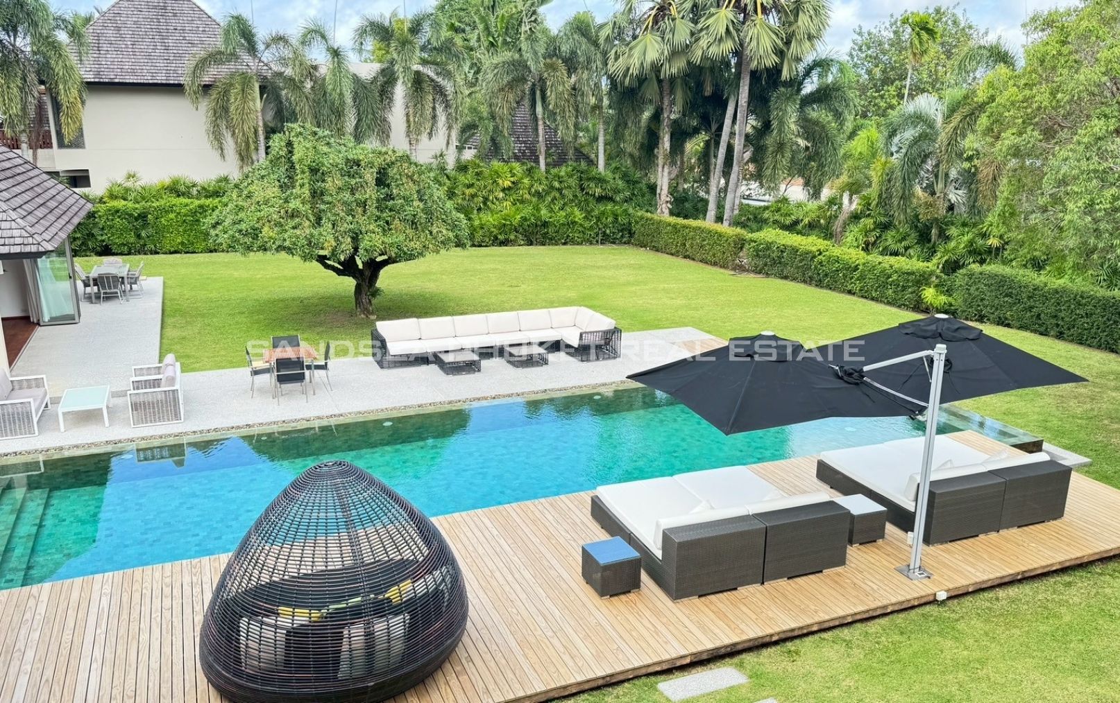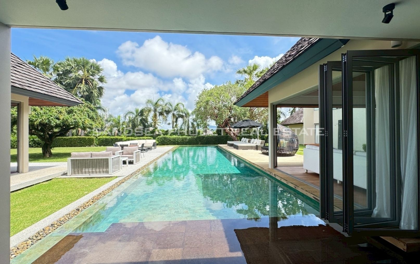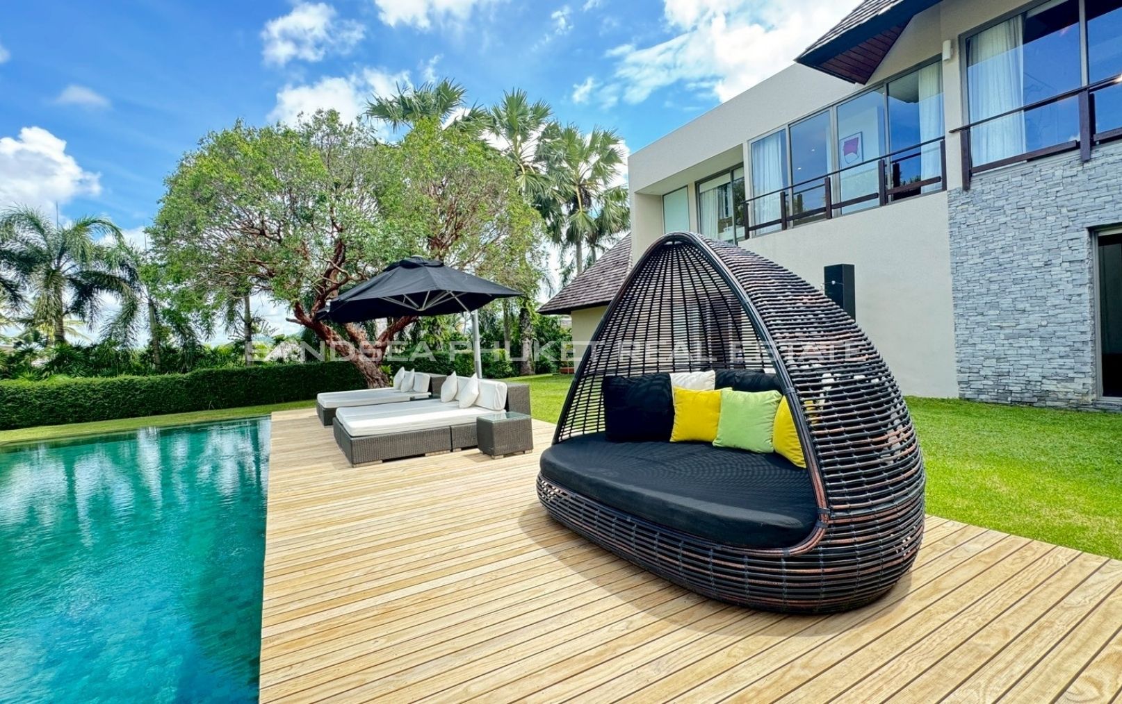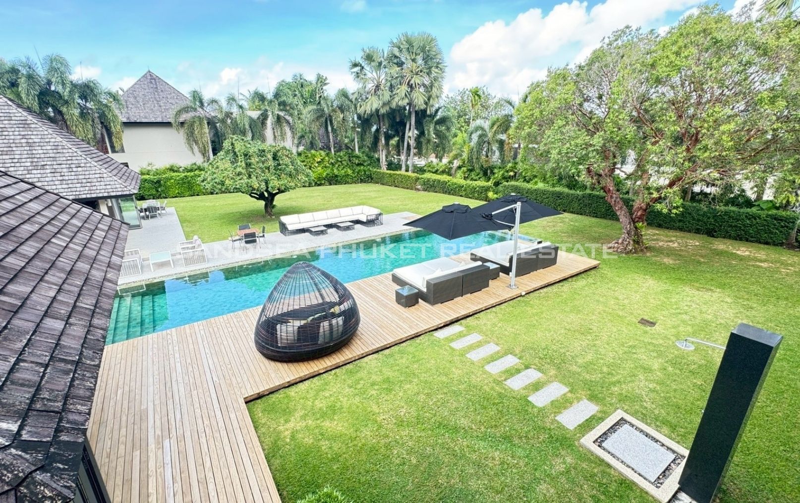 An oasis of peace, a place to live life at it’s best. A 1,900 meter, 4/5 bedroom Villa, in a 2000 meter garden, designed around a 24 meter long Pool at the hart of the villa and garden. You will enjoy beautiful days and nights surrounded by a tropical garden in full privacy. The biggest gardens on this side, the most entertainment offering and beach rich side, of the island. 8 minutes from the beautiful beaches of Bang Tao and Surin, the first, peaceful and endless, the second, buzzing with entertainment. Beach clubs (Nicky Beach, Xana, Bliss, Catch), bars, restaurants, island shopping. Its all within a 5 to 15 minutes radius. The best location to be on the island if you want to get a taste of the better side of Phuket island life, while staying in an oasis of peace and luxury enjoying the garden, pool and grand living spaces you reside in.