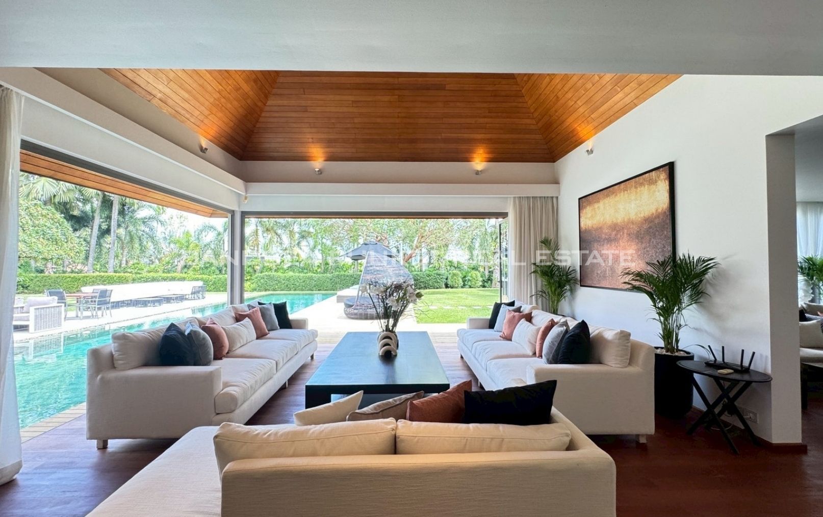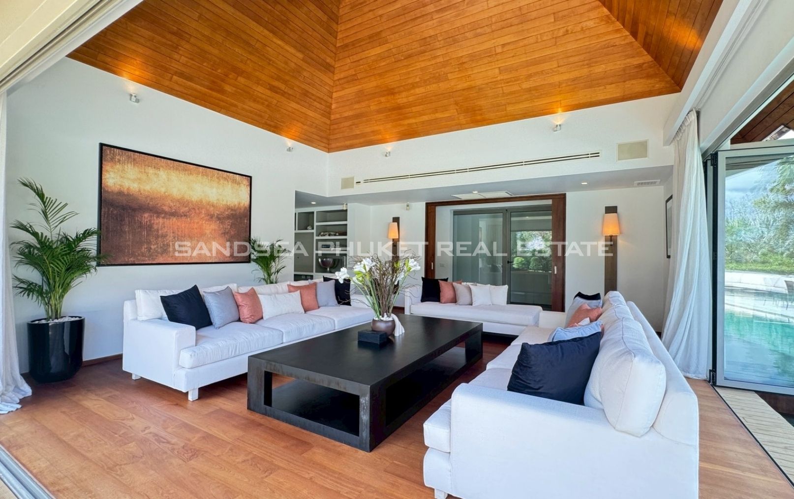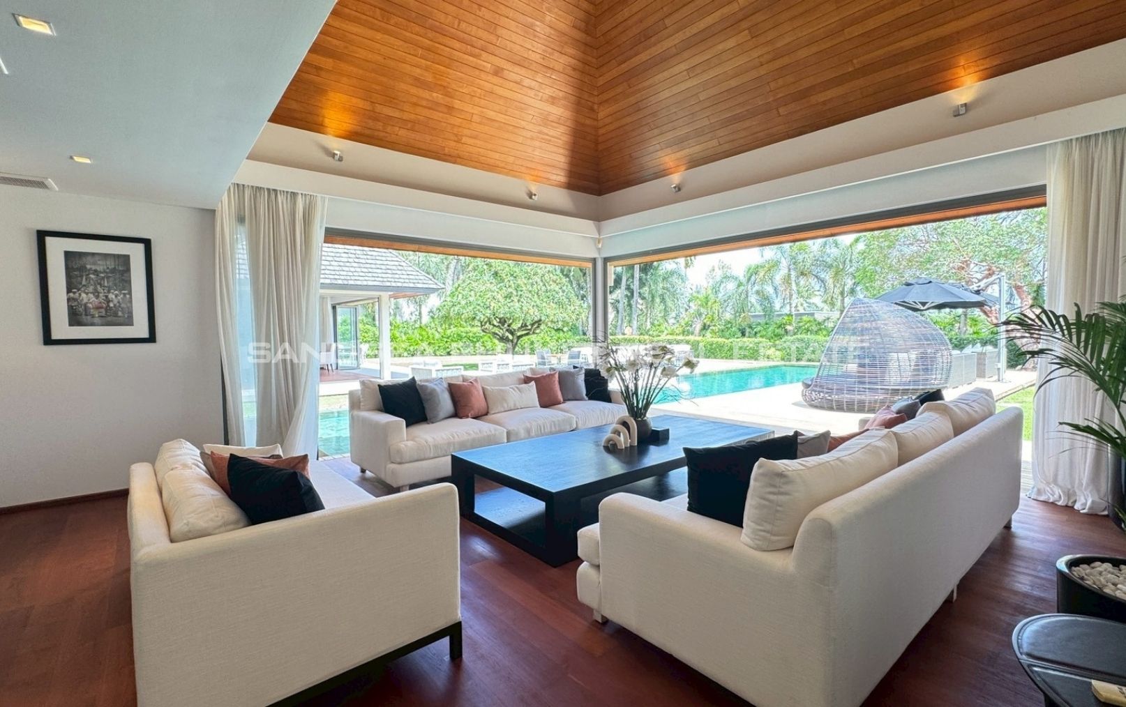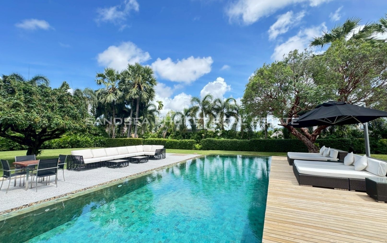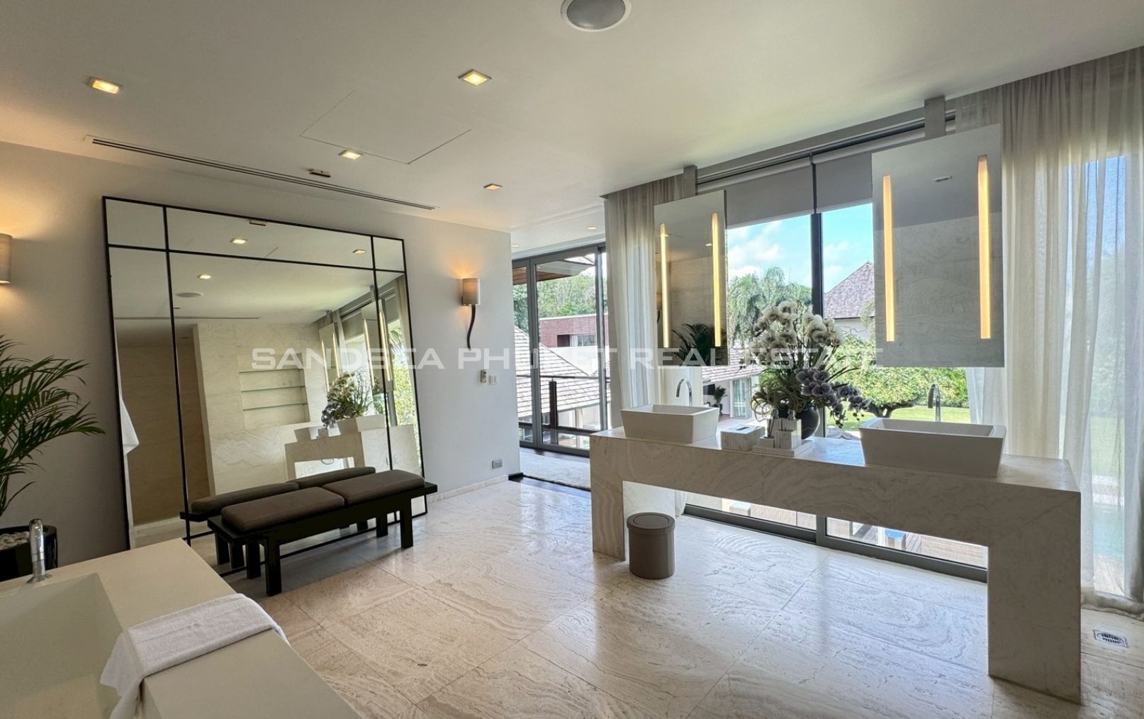 An oasis of peace, a place to live life at it’s best. A 1,900 meter, 4/5 bedroom Villa, in a 2000 meter garden, designed around a 24 meter long Pool at the hart of the villa and garden. You will enjoy beautiful days and nights surrounded by a tropical garden in full privacy. The biggest gardens on this side, the most entertainment offering and beach rich side, of the island. 8 minutes from the beautiful beaches of Bang Tao and Surin, the first, peaceful and endless, the second, buzzing with entertainment. Beach clubs (Nicky Beach, Xana, Bliss, Catch), bars, restaurants, island shopping. Its all within a 5 to 15 minutes radius. The best location to be on the island if you want to get a taste of the better side of Phuket island life, while staying in an oasis of peace and luxury enjoying the garden, pool and grand living spaces you reside in.