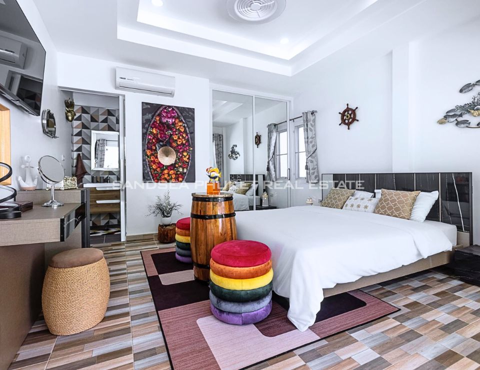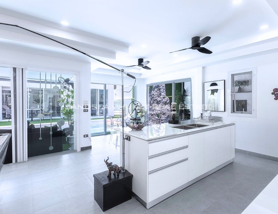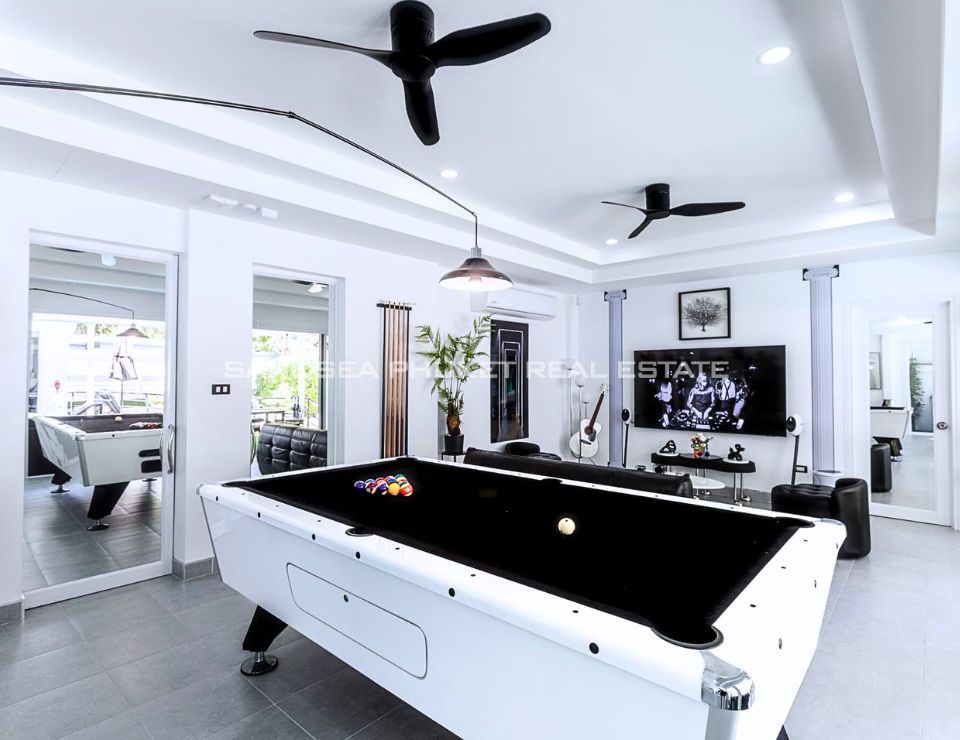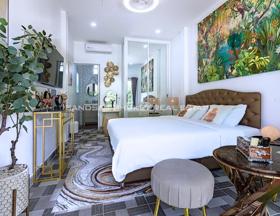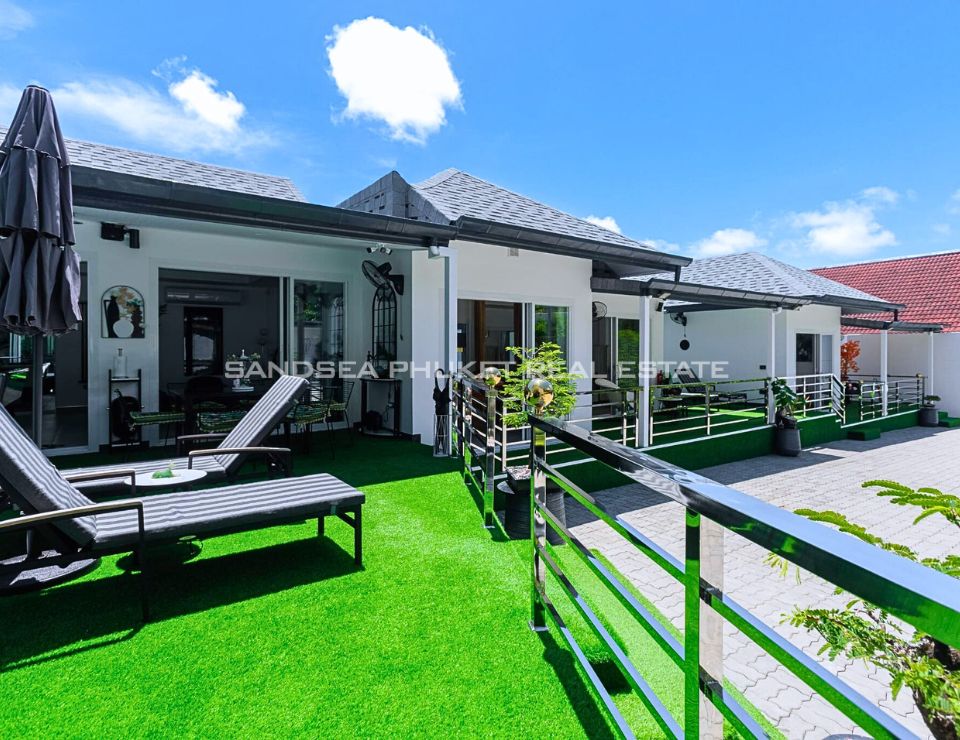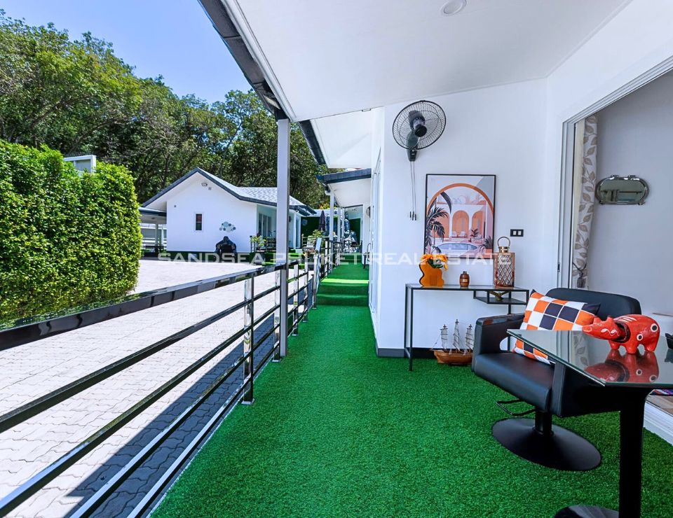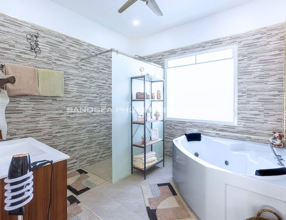 This is a completely modern villa and very spacious and uniquely designed. The design is complemented by well selected fixtures and fittings. An open plan living area with western style kitchen with full appliances (Electric Hob, Hood, Oven, Microwave, Refrigerator, Dishwashing machine, BBQ grill). Each room is independent and includes a bathroom, terrace, and complete of convenient equipment, TV, Air-con, and ceiling fan. Private carport with amble space for cars and motorbikes, Storage room, washing machine, dryer machine
